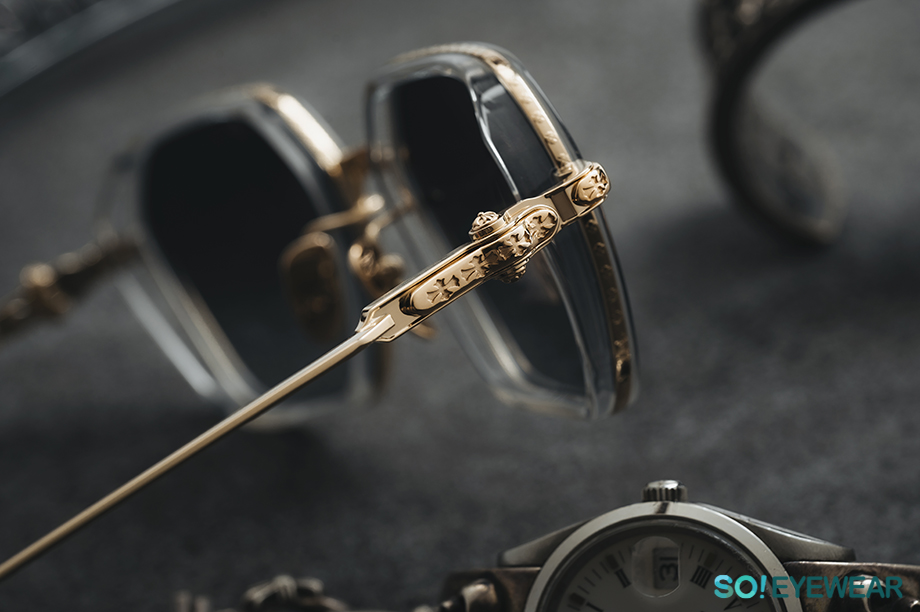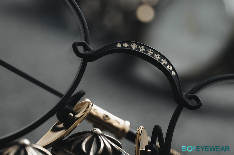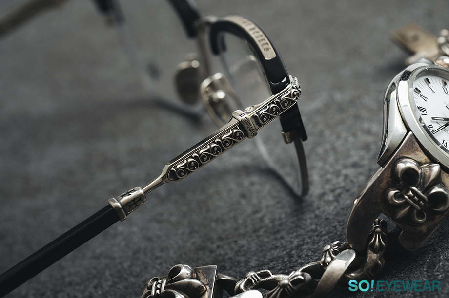 眼鏡上招牌的十字架銀飾造型,充分地展現出Chrome Hearts銀飾設計的藝術美感及工藝深造之處。銀飾皆採手工製作,保留925銀氧化後的黑色物質,再經過拋光打磨,呈現由外到內、亮面至灰黑的層次感。