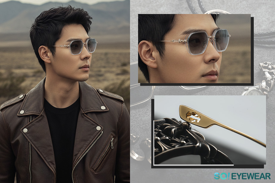 粗獷眉框線條搭配精密雕花,半框的俐落感中透著不羈氣息。純銀細節在深色框面上低調閃現,如同酷帥潮男的一抹鋒芒。一戴上便是皮衣系的個性存在,沉穩卻帶著難以忽視的力量。