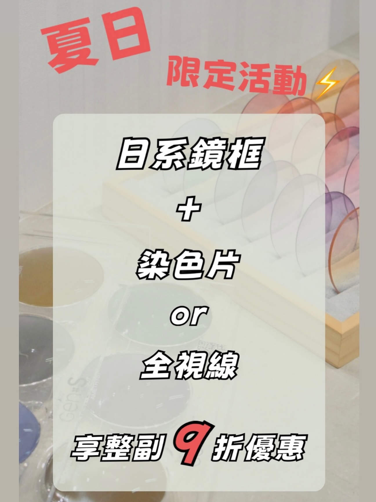 凡來店選購 「 日系鏡框+染色片or全視線 」 ,即享整副9折優惠。