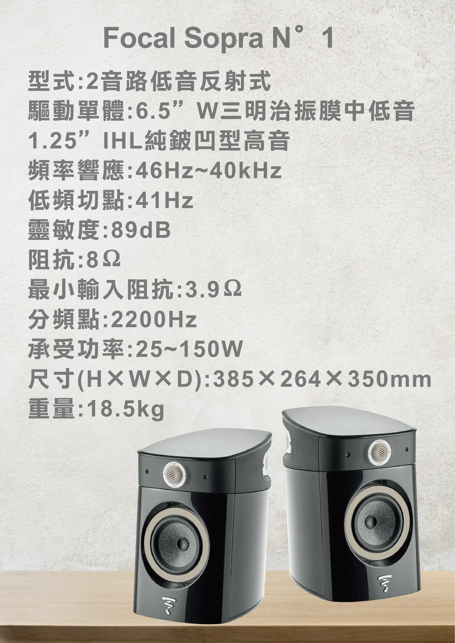 主角選擇 FOCAL Sopra N°1 書架喇叭,以鈹高音與 W 振膜單體,呈現極低失真與寬鬆中頻,將法式聲音美學展現得細緻而耐聽