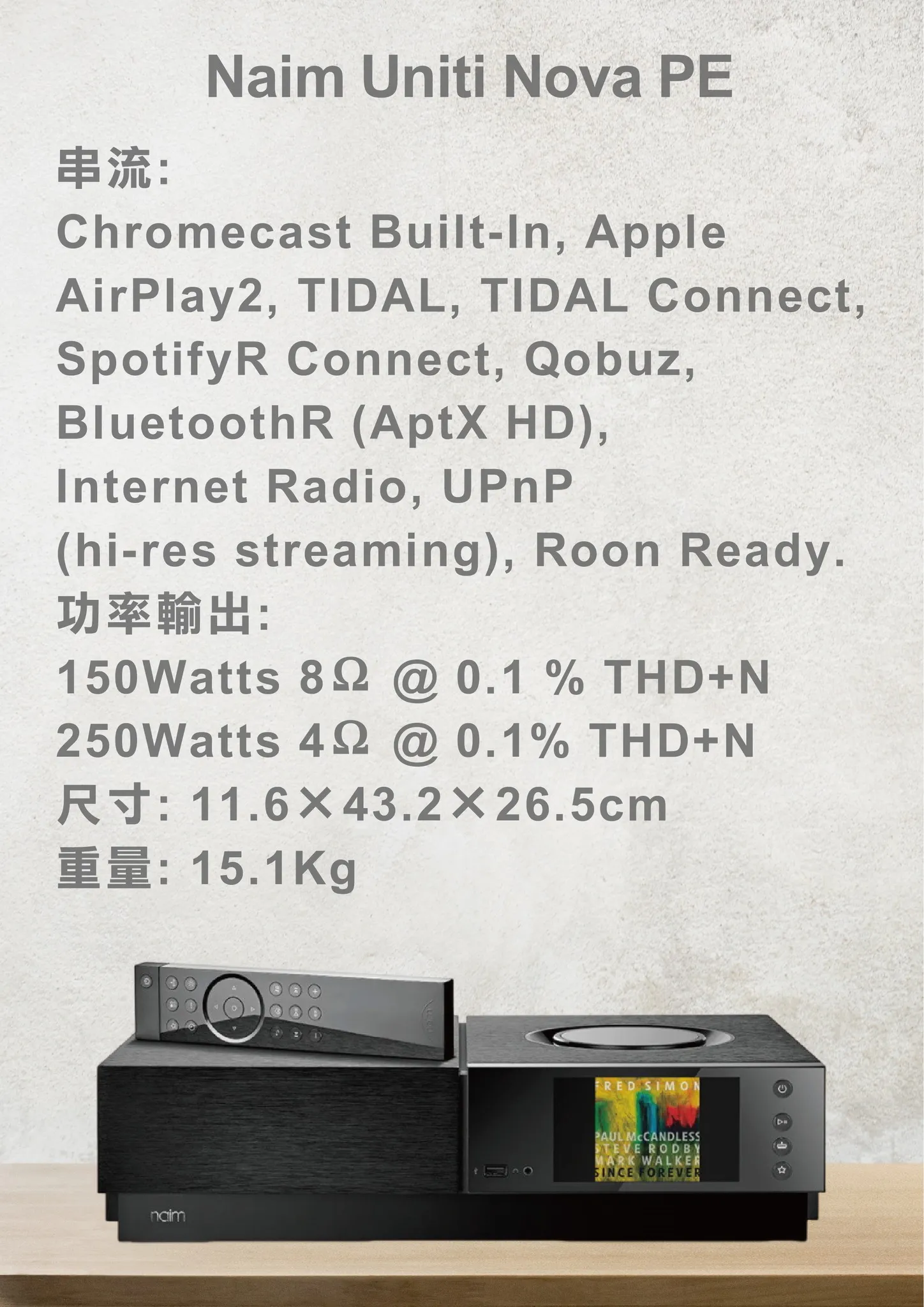 搭配 naim Uniti Nova PE版 一體式串流擴大機,內建高功率放大與完整串流平台,讓系統在簡潔架構下,仍能保有控制力與細節