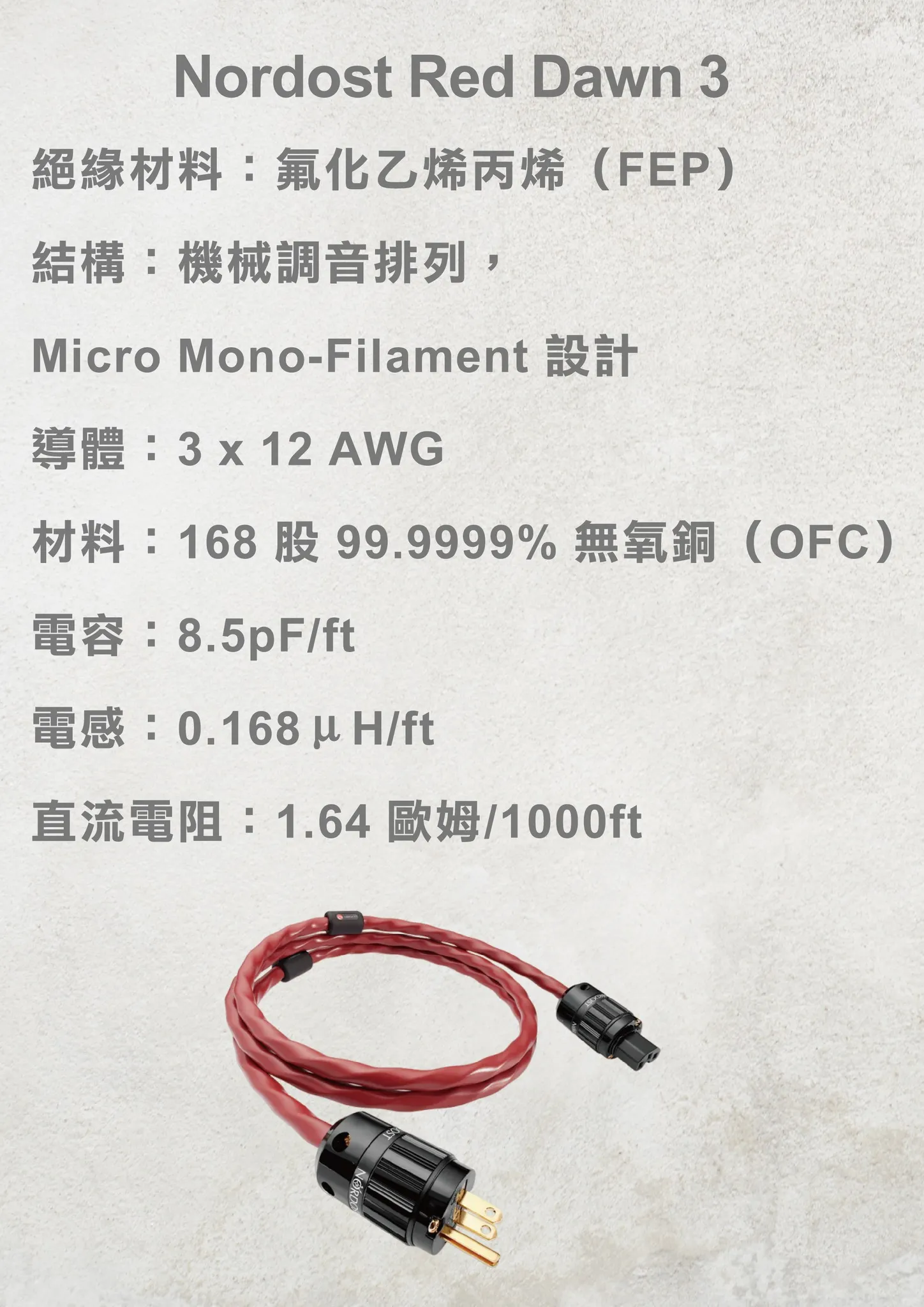 Nordost Red Dawn 3 電源線,提供乾淨穩定的電源,提升背景黑度與動態表現