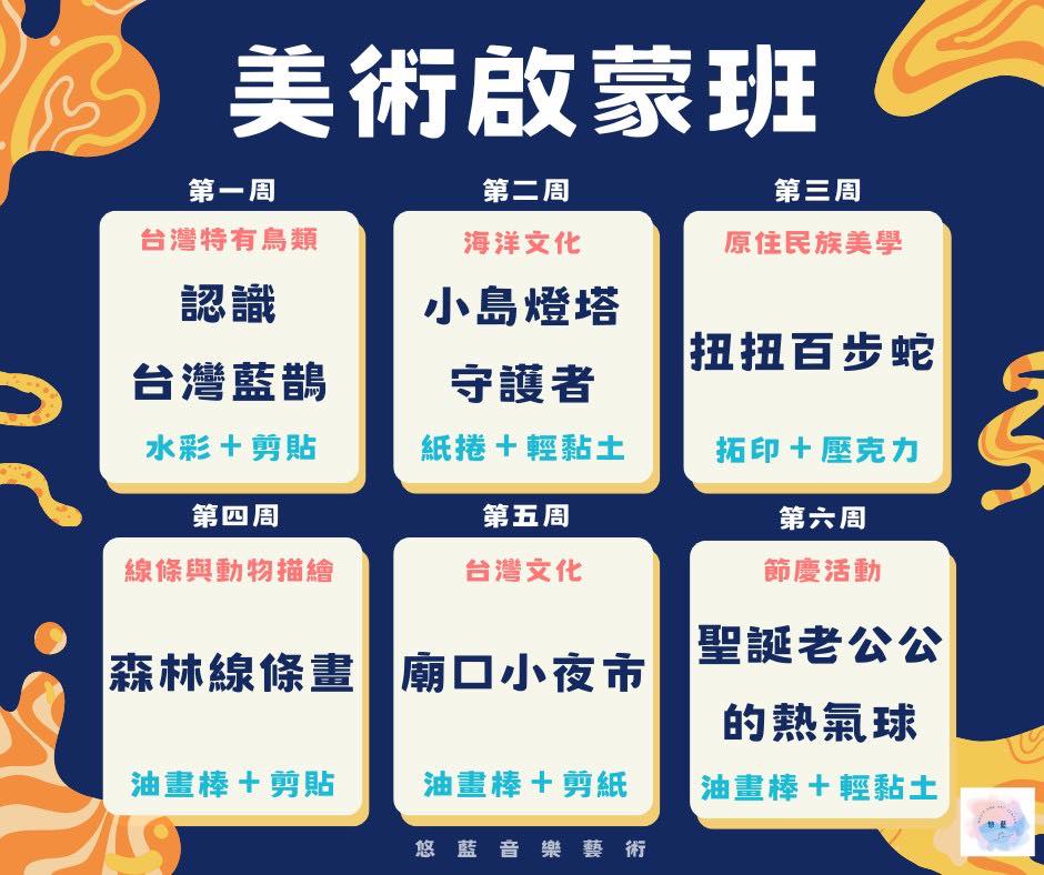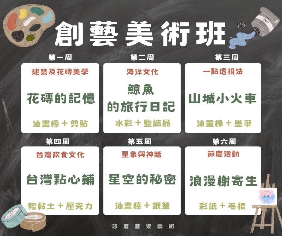 • 多媒材體驗:水彩、素描、油畫棒、剪貼、輕黏土、拓印、墨筆、鹽結晶、銀筆…讓創意無限延伸。