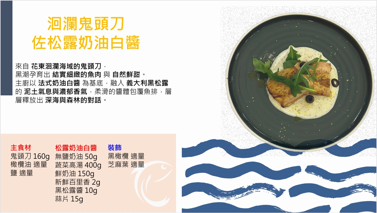 花東洄瀾海域湍急黑潮,孕育質地細嫩富含豐富蛋白質的飛虎魚排,佐搭傳統法式奶油白醬及高等級黑松露醬,層層堆疊出飛虎魚排不凡的風味。