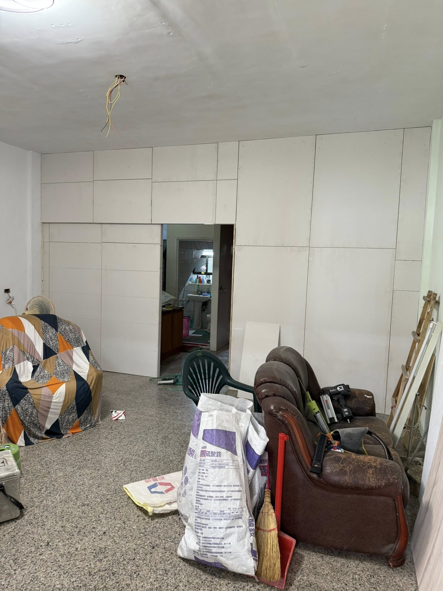 施作項目:平釘天花板施工、雙面隔間、滑門訂製、油漆、全室抽換線、燈具