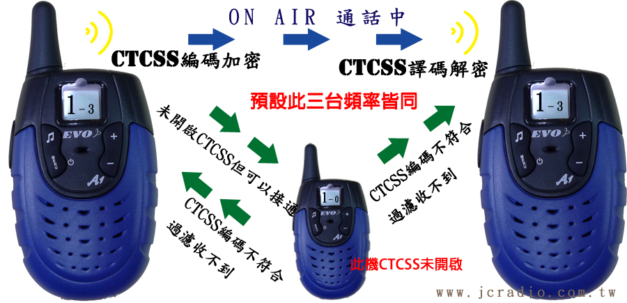 也許有人會想,要是台灣這麼多人都在使用同樣FRS免執照所規定的十四組頻率,不是很容易就會互相干擾了嗎?這時候對講機還有一種技術叫CTCSS (Continuous Tone-Coded Squelch System),以技術來區分俗稱叫做類比tone;另外還有比較高階技術的DCS (Digital-Coded Squelch),俗稱數位tone。中文有很多別名諸如干擾消除靜音碼、靜音碼、啞音頻。