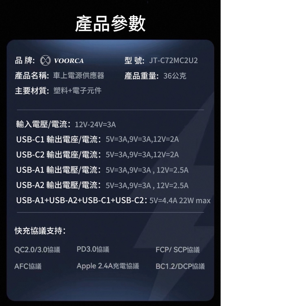 ◆ 72W超級快充 ( QC*2 / PD*2 ) ◆ 不挑車型,12V / 24V 通用。 ◆ 加厚防滑片,卡扣式鎖緊,快充不斷電。 ◆ 支援蘋果27W PD快充,30分鐘可充滿70%。 ◆ 內置升級智能芯片,有效保護手機,防止安全隱患。 ◆ 支援四台設備同時充電,兼容QC/PD/PPS/AFC等協議,適用各種平板和手機等設備。
