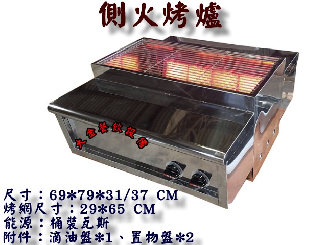 側火烤爐 尺寸:69*79*31/37 CM 烤網:29*65 CM 能源:桶裝瓦斯 附件:滴油盤*1、置物盤*2 單價:$25000/1台(未稅) (原台中市市區一樓免運費其他外縣市酌收運費)