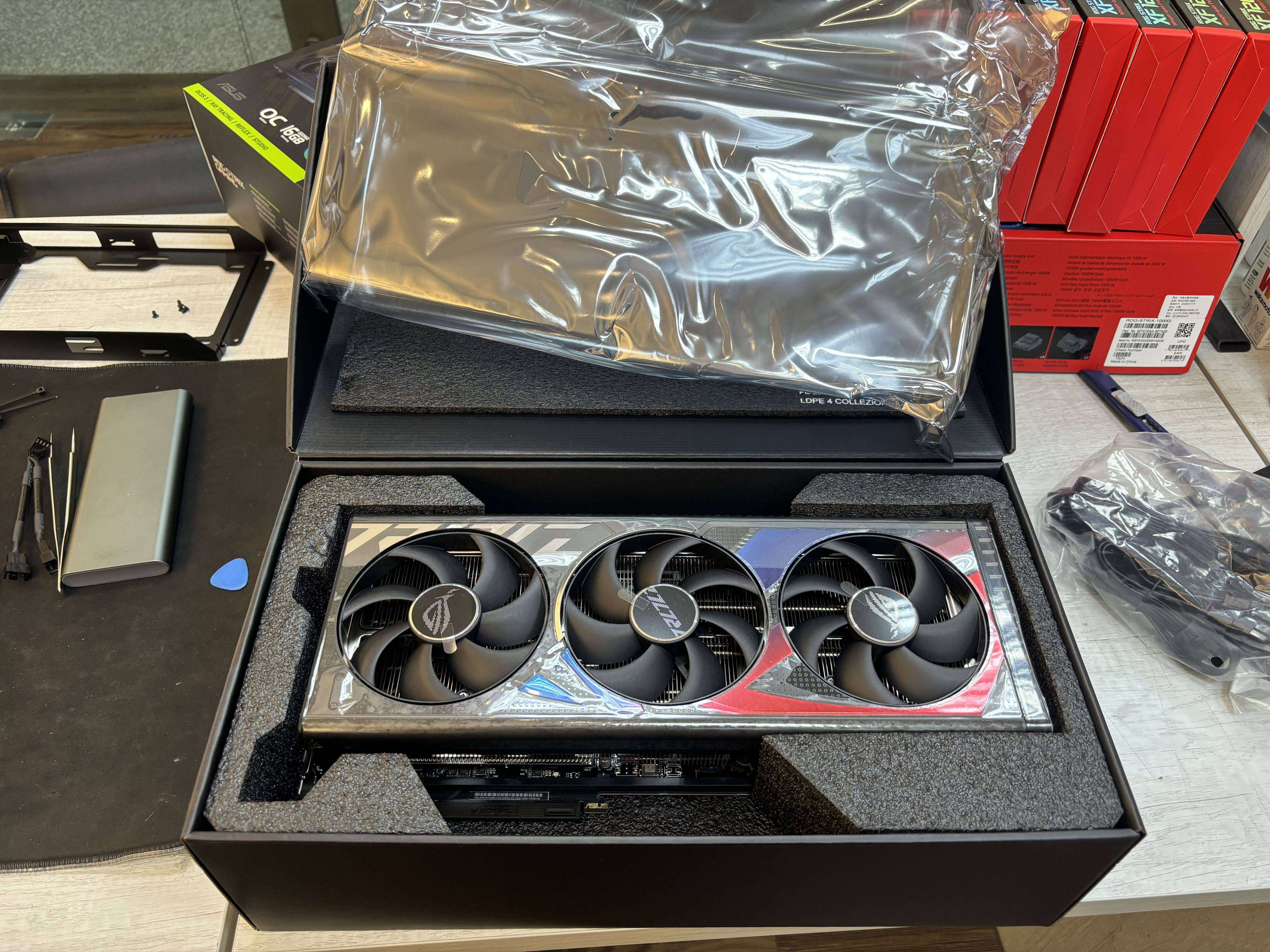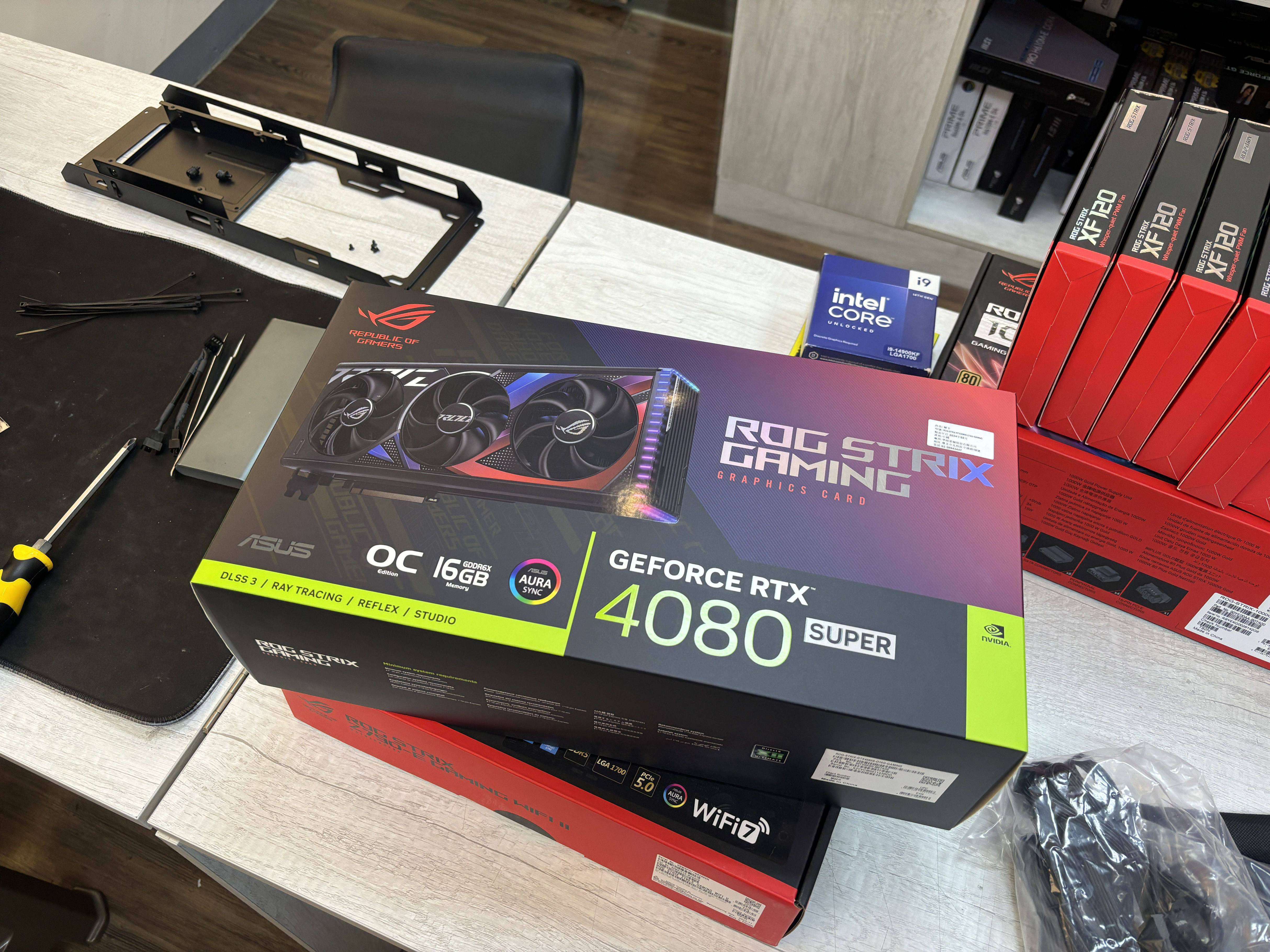 當然還有我們另一位主角了,就是ROG STRIX GAMING 4080 SUPER了,大家能夠感受出它的重量嗎??說真的蠻重的,近期流行的AI效能,全都可以靠它來搞定了,尤其在渲染方面那可是專家,如果有興趣看更詳細的話可以參考這邊。補充底下還有送個顯卡支架+1。