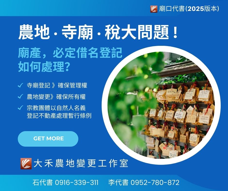 ▪️農地上的寺廟,透過 #寺廟用地變更 是就地合法的唯一途徑。你與神有約,大禾與你同行!