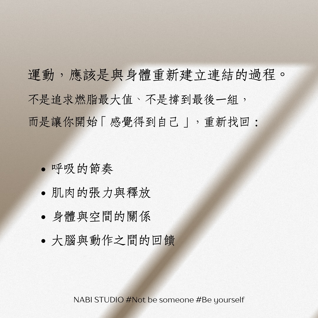 不是追求燃脂最大值、不是撐到最後一組,而是讓你開始「感覺得到自己」,重新找回: