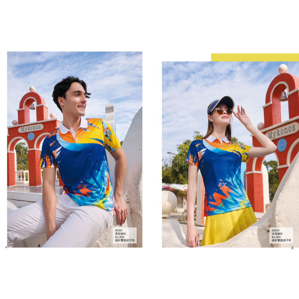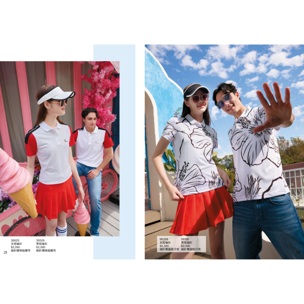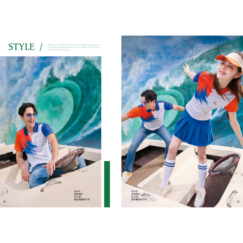 此種效果,讓團體服/休閒服布料多了立體的風格,接著應用畫龍點睛式的設計法,將不同色系的線條,表現在肩線和公主線(女版),衣身線(男版)上,讓整件衣服看起來,俐落大方,時尚年輕。由於我們材質選用的是涼爽的排汗布,所以此件作品,在夏天穿著,不但擁有外在美,內在美的功能我們也兼顧到了。除了團體服外,更廣闊運用在,例如: