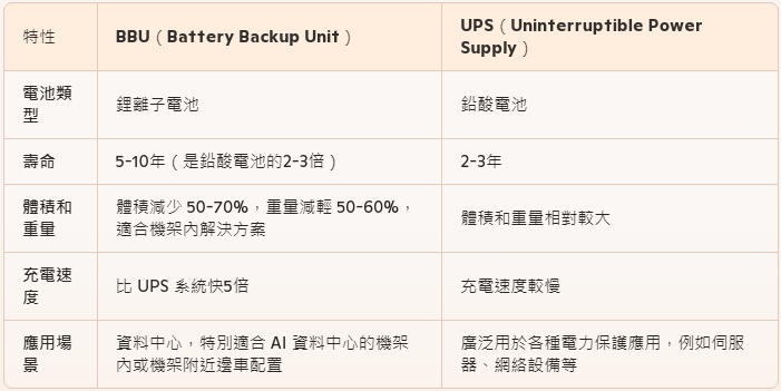 BBU 可以看作是傳統 UPS 的進階版本, 與使用鉛酸電池的 UPS 系統相比, 配備鋰電池的 BBU 具有壽命較長 (BBU 的產品預期壽命為 5-10 年, 是鉛酸電池的 2-3 倍), 緊湊設計