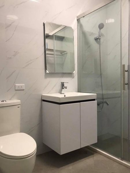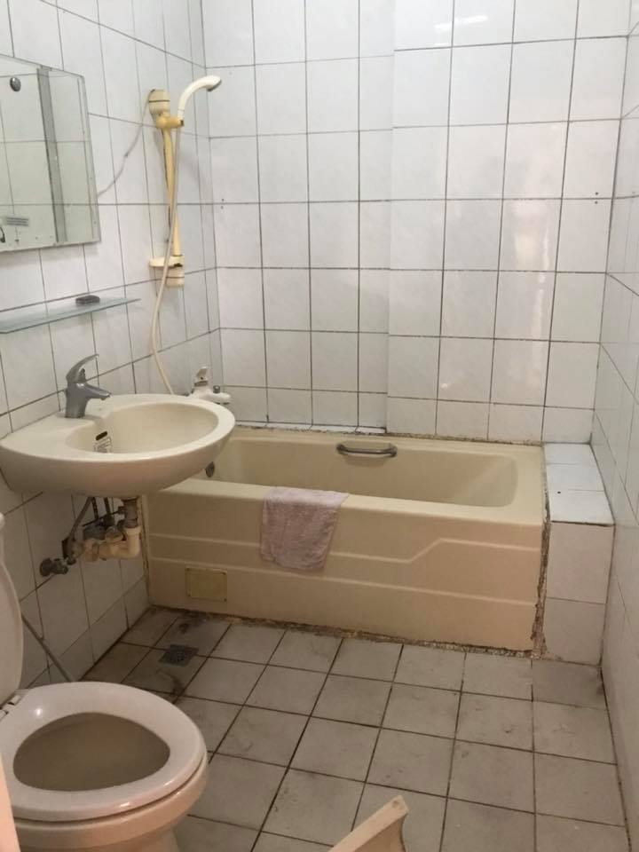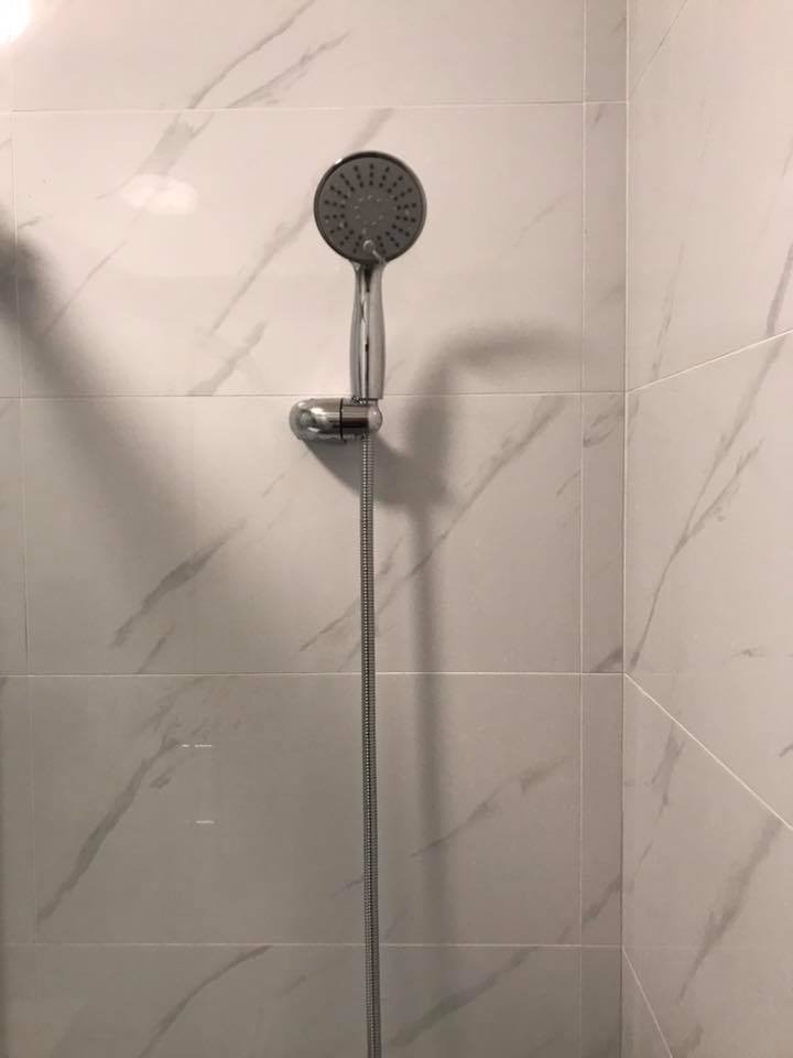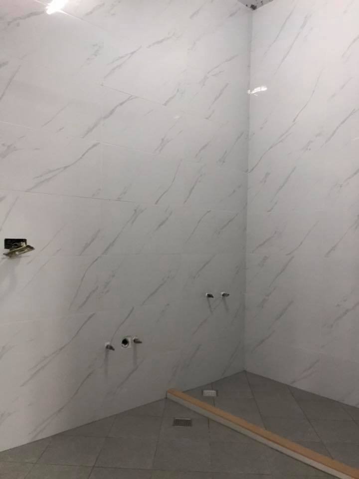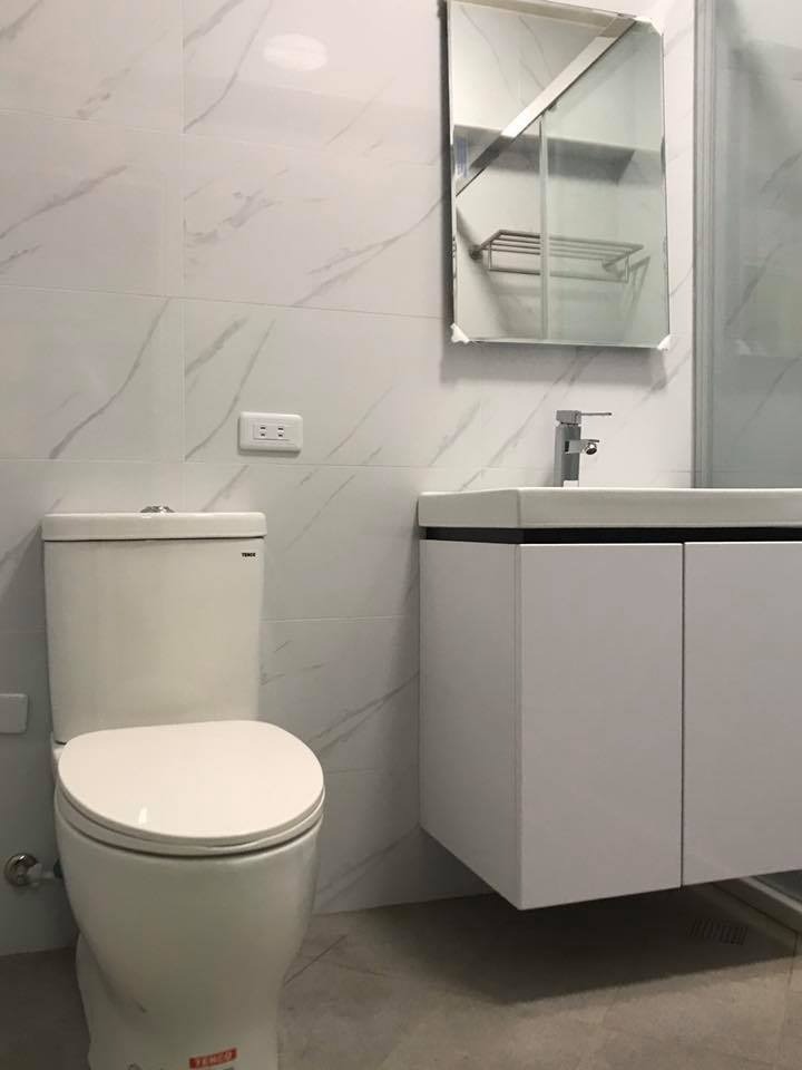 打除原有浴室磁磚及浴缸,全室施作一底四道防水層至頂,搭配明亮大理石紋磁磚