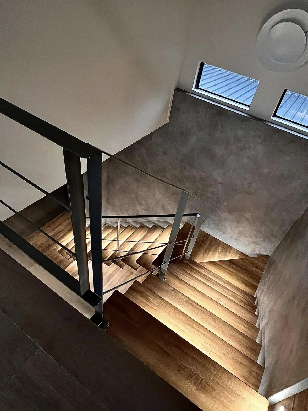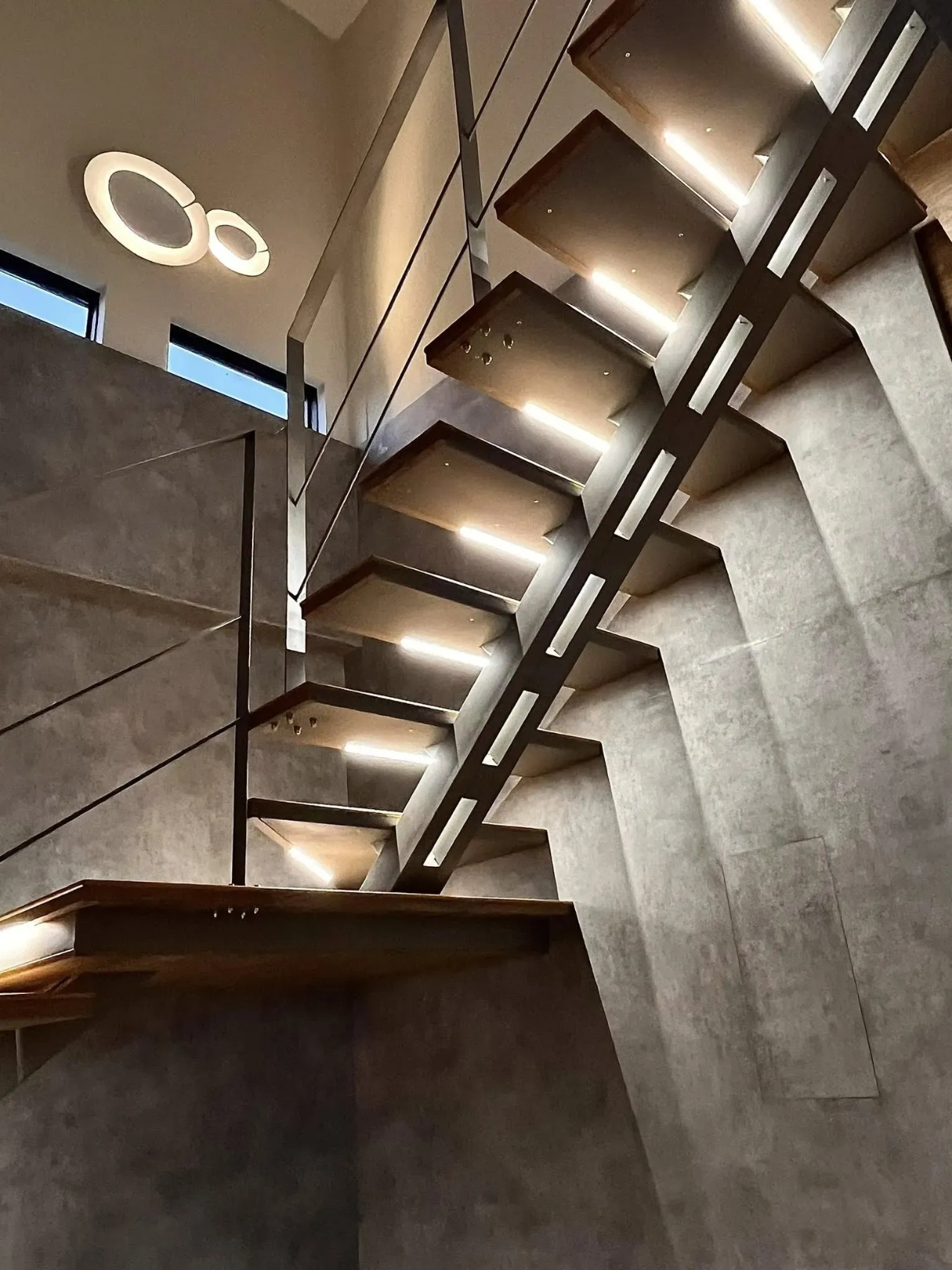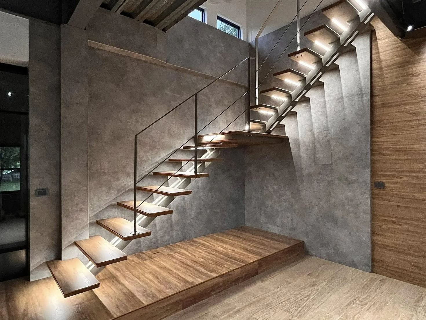 有別於一般鋼構梯給人的粗獷印象,本次我們使用扁鐵+細圓柱扶手,讓龍骨梯多了細緻的感覺,搭配上木踏階及預埋的燈條,成為了家中最亮眼的存在