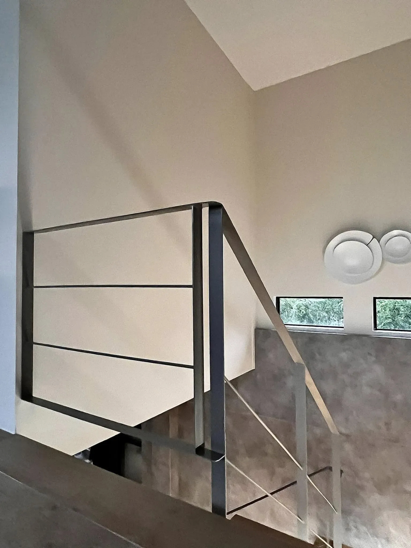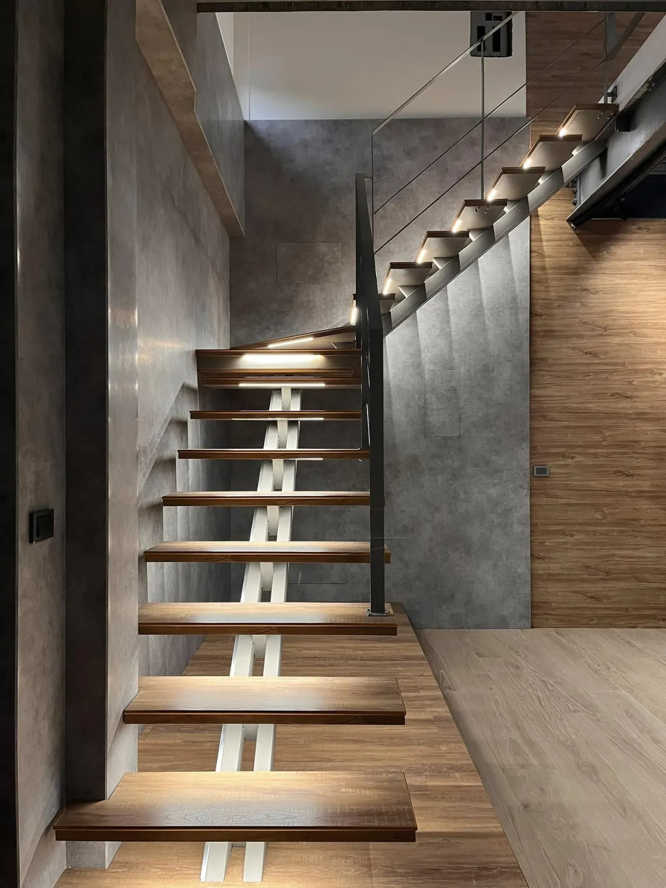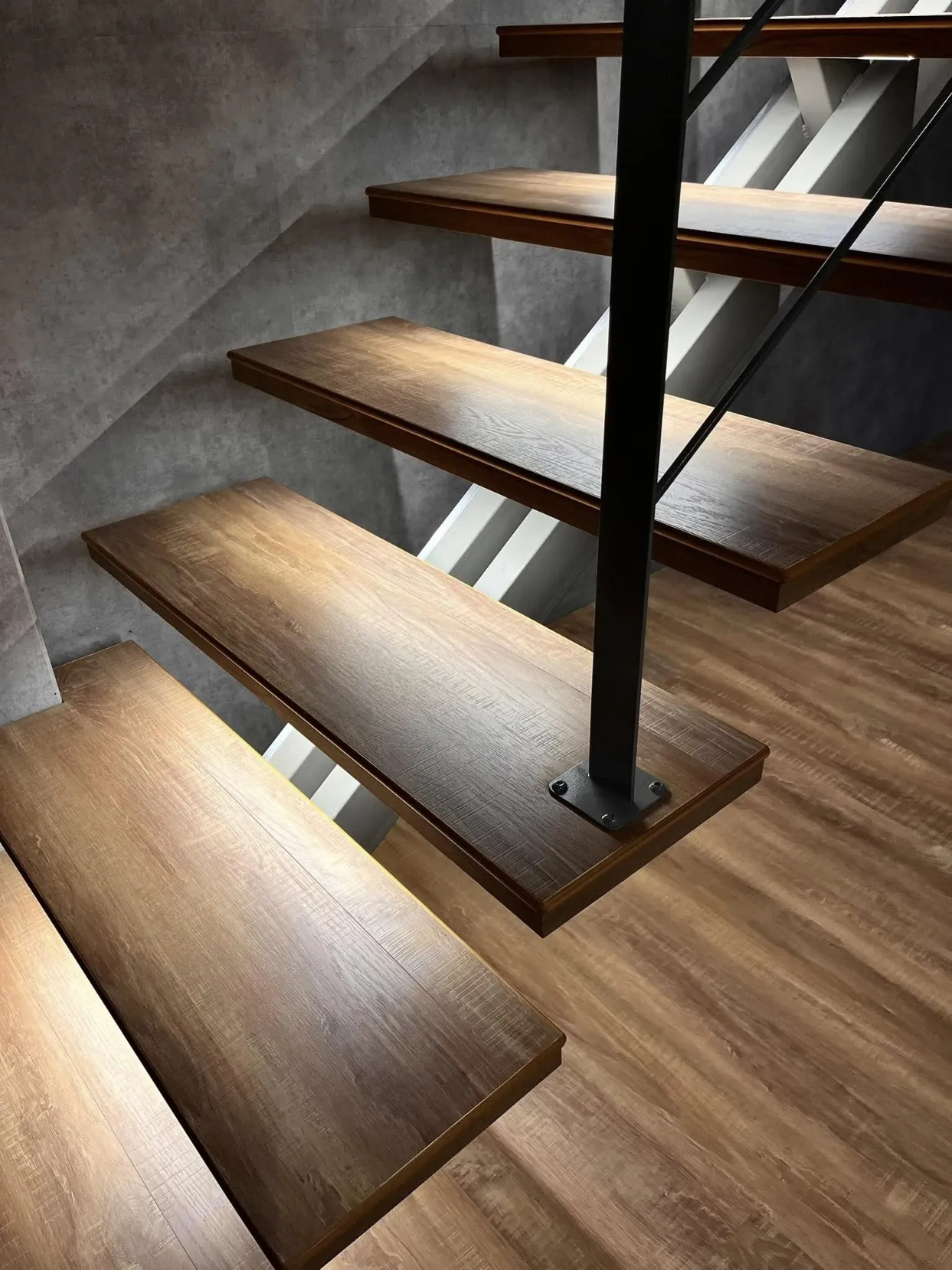 有別於一般鋼構梯給人的粗獷印象,本次我們使用扁鐵+細圓柱扶手,讓龍骨梯多了細緻的感覺,搭配上木踏階及預埋的燈條,成為了家中最亮眼的存在