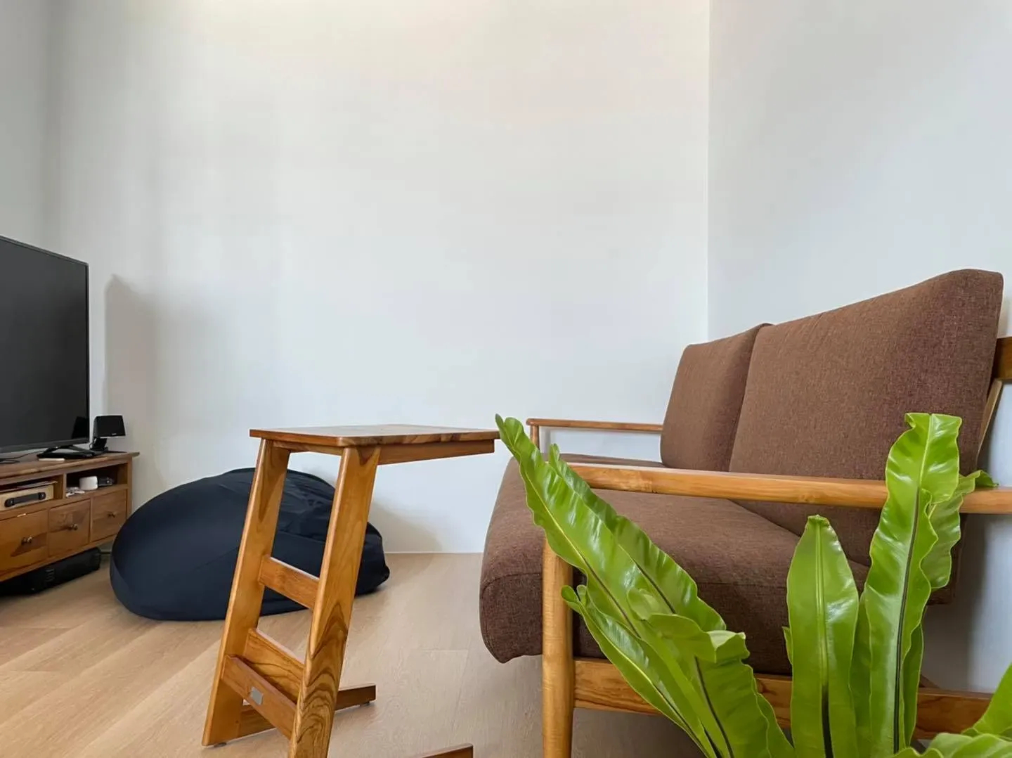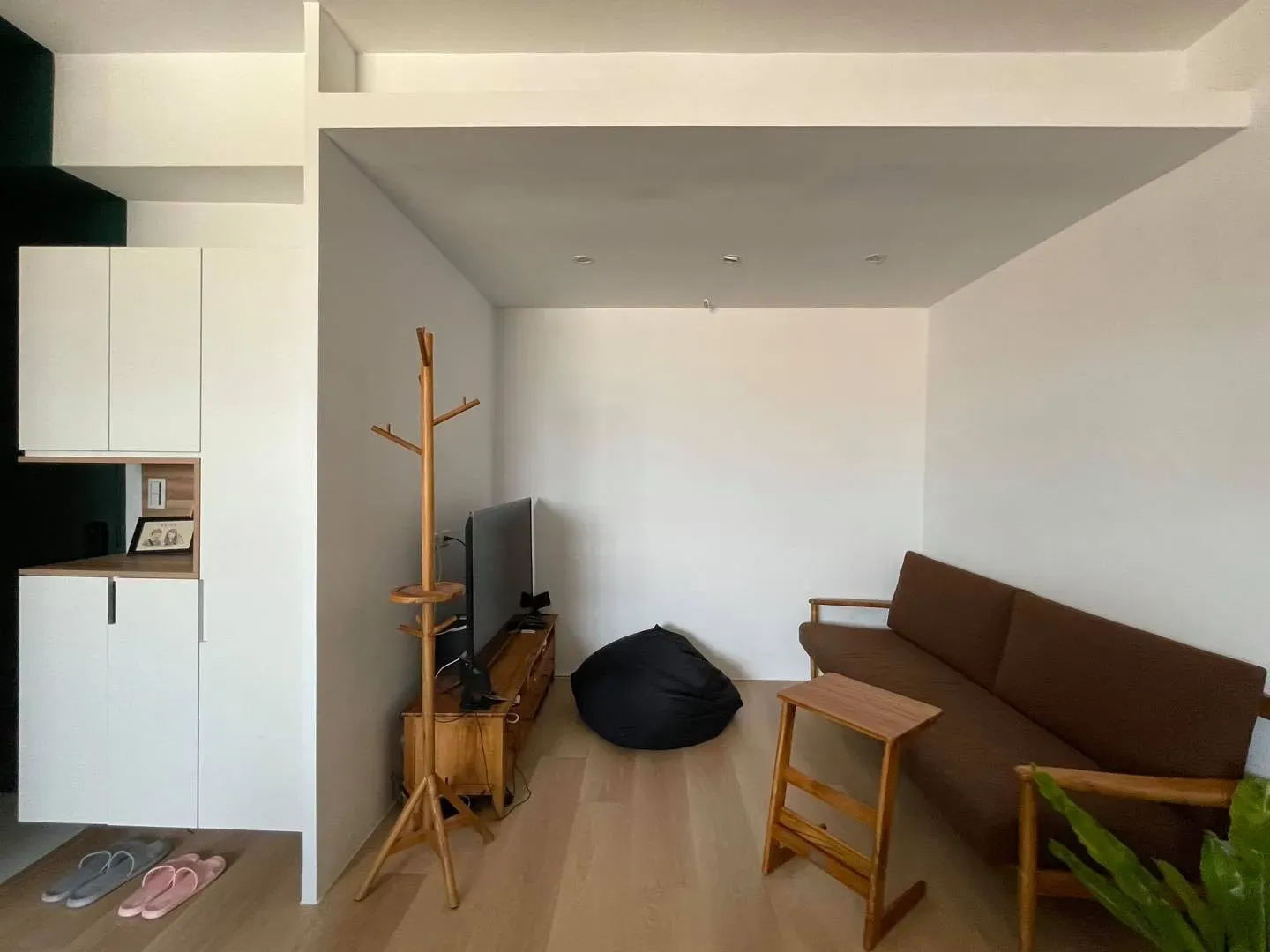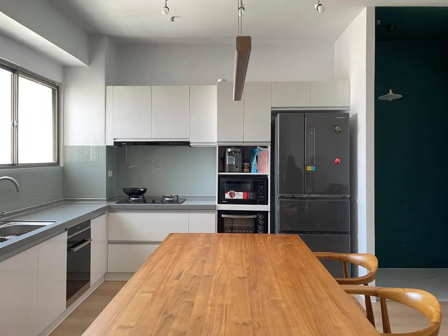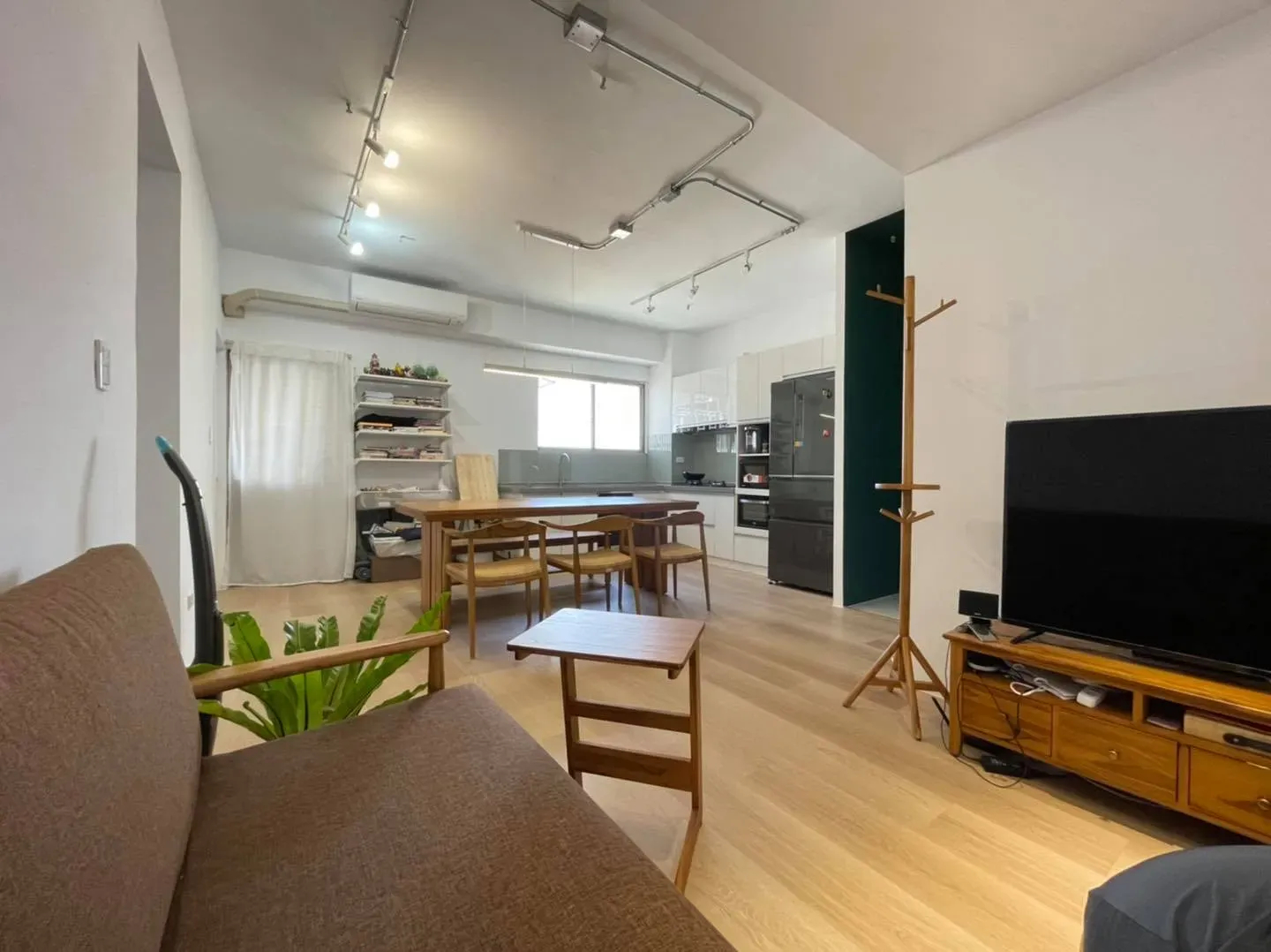 今天的案例是小家庭居住的中古公寓,因為室內坪數不大,所以客廳和廚房做開放式的空間規劃,天花板也不再木作降低高度。全室純白色的牆面、櫃體,搭配橡木色地板和玄關深綠主牆跳色,以及業主夫妻選用的柚木傢俱,溫馨又簡單。