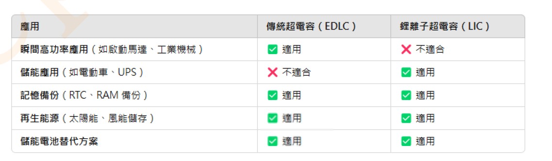 1. 超電容(Supercapacitor),又稱電化學電容器(Electrochemical Capacitor)或雙電層電容(Electric Double-Layer Capacitor, EDLC),是一種介於傳統電容器與電池之間的儲能裝置。超電容具有高功率密度、快速充放電能力、超長壽命等特點