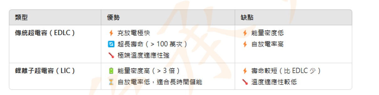2. 鋰離子電容 Lithium-ion Supercapacitor (Li-ion Supercapacitor, LIC).是鋰電池 + 超級電容 => 有比電池較高的Cell 電壓 與 較低的自我放電率