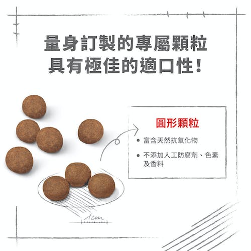 成分:脫水禽肉蛋白、動物脂肪、小麥麩質*、玉米、甜菜漿、小麥麵粉、玉米麩質、米、小麥、水解動物蛋白(家禽)、礦物質、玉米粉、大豆油、酵母產品、魚油、果寡糖、水解酵母(甘露寡糖及β-葡聚糖來源)(0.30%)、裂殖壺藻油(DHA來源)、金盞花、絲蘭汁。*L.I.P.:嚴選消化率90%以上的蛋白質