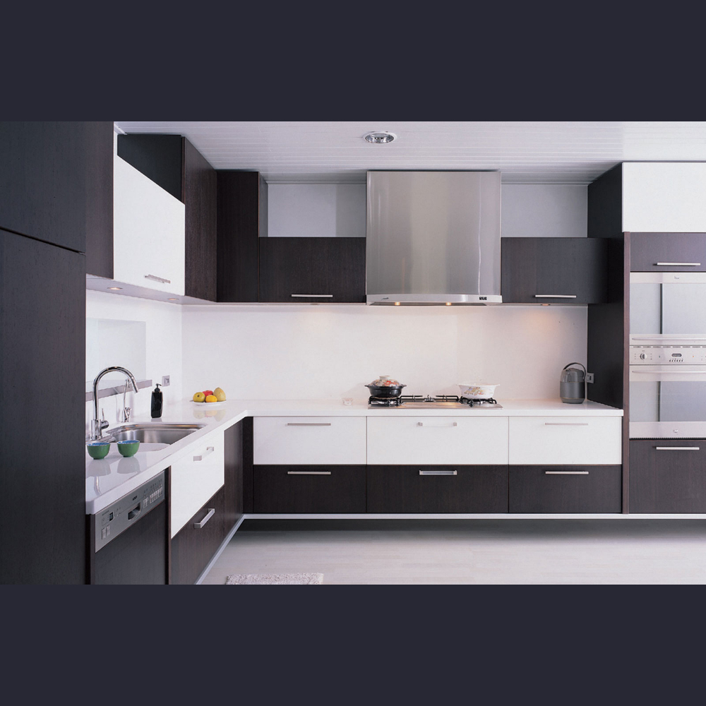 L型設計壁面人造石一體成型,門板雙色雙材質(白色鋼琴烤漆、深色實木烤漆混搭),懸空設計,好清潔又防蟑。