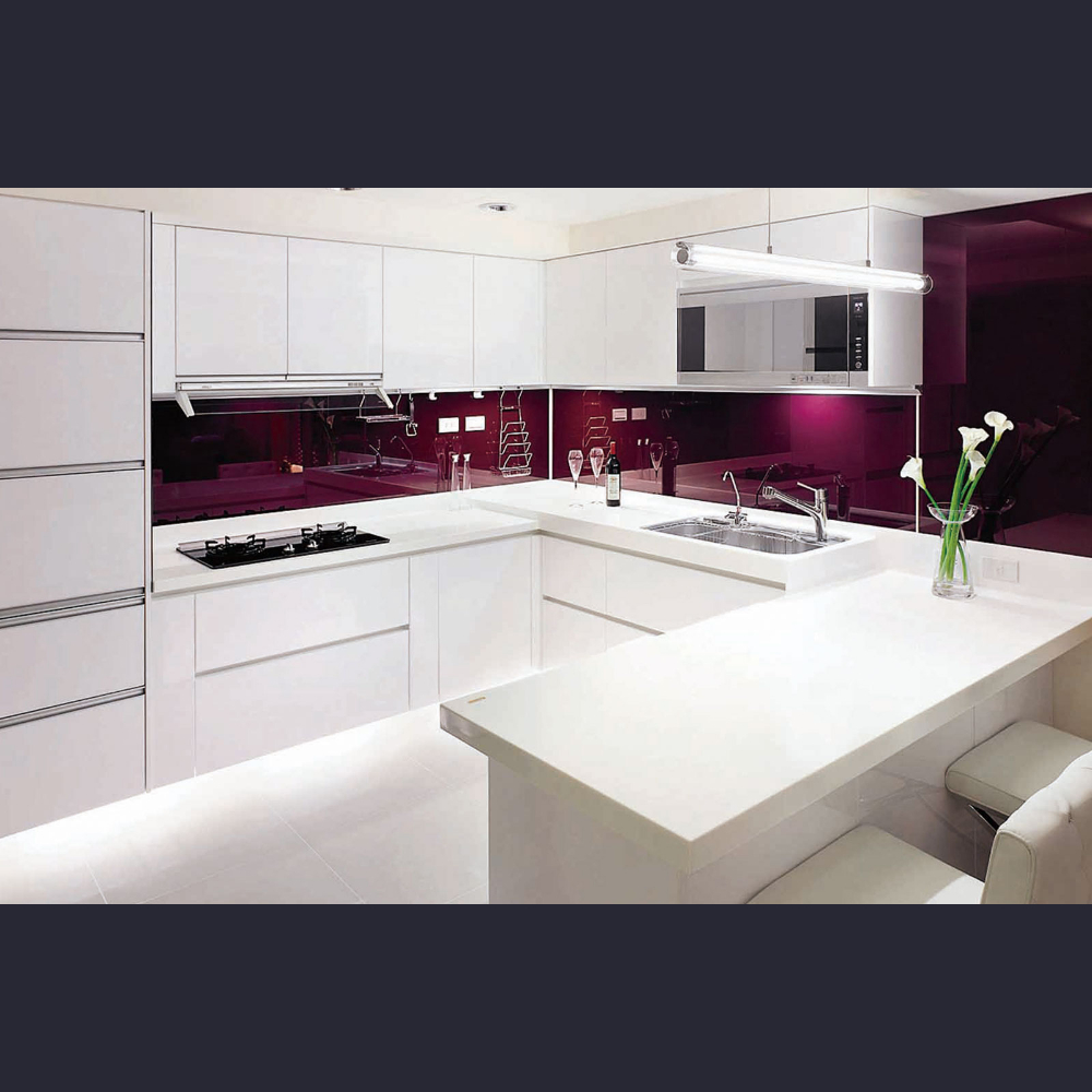 ㄇ型廚具-高中低人體工學設計,水槽高(88cm高)洗、切,腰不酸,爐較低(83cm高)炒菜手不酸,餐桌較低(75cm高)標準高度,小空間全功能,特而強化烤漆玻璃及清潔又美觀。