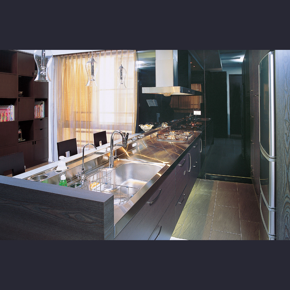 日式開放式廚房-靠牆一面冰箱,電器,收納;洗、切、炒,在半島兼具餐桌功能,不再面壁,互動良好,中隔凸臺附加功能槽,高低差設計。