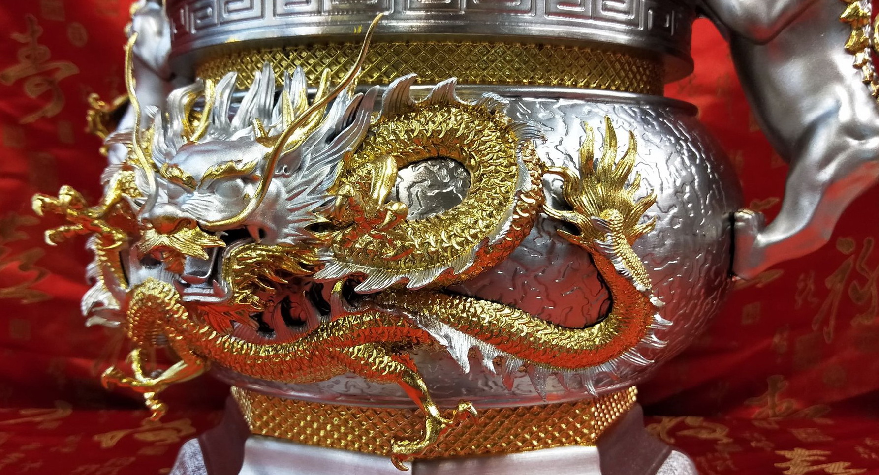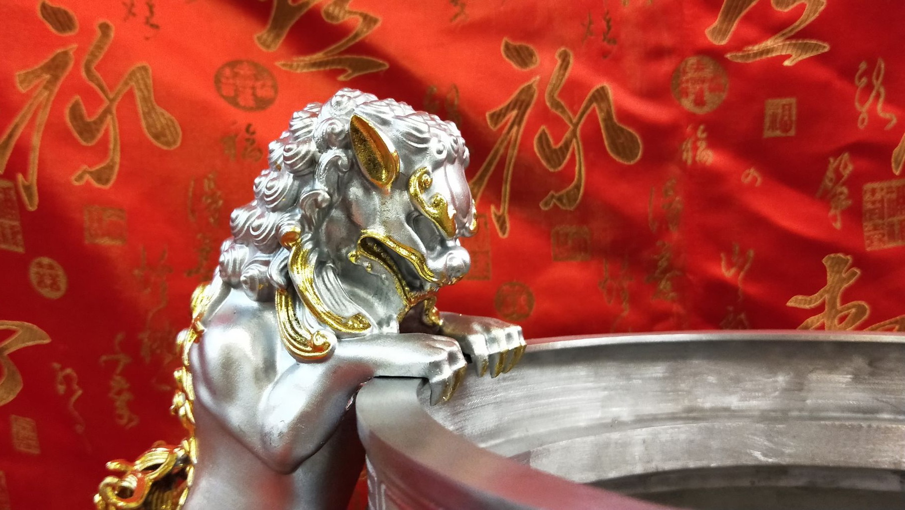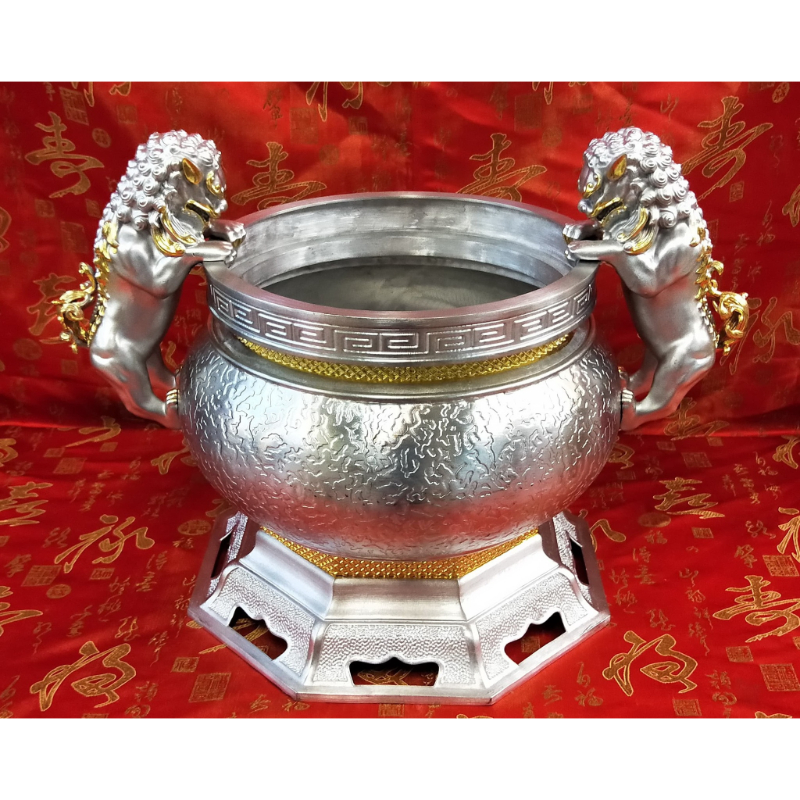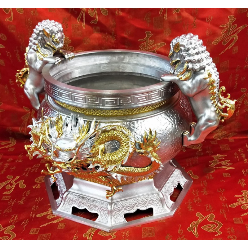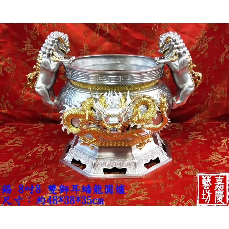 【嘉慶 錫 8吋8 雙獅耳蟠龍圓爐】