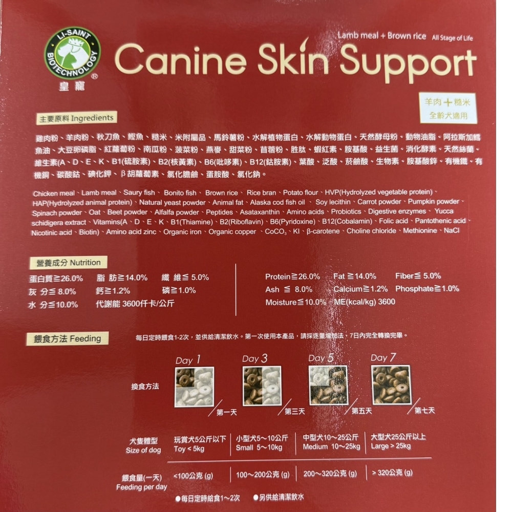 蛋白質26.0%以上 脂肪14.0%以上 纖維5.0%以下 灰分8.0%以下 水分10.0%以下 鈣1.2%以上 磷1.0%以上