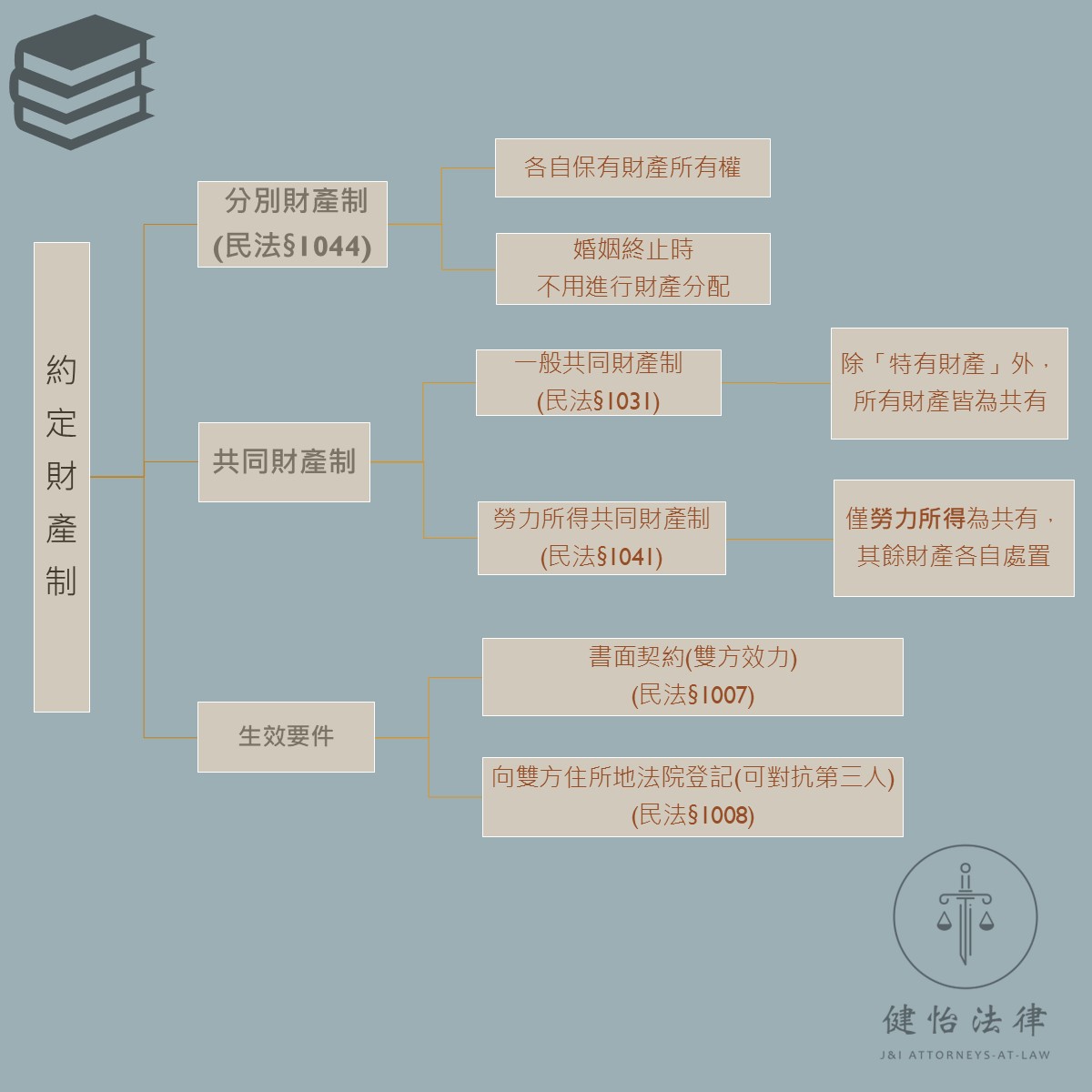 除了法定財產制,另有約定財產制,是指以契約約定夫妻財產關係。我國法律對於約定財產制分為共同財產制及分別財產制。