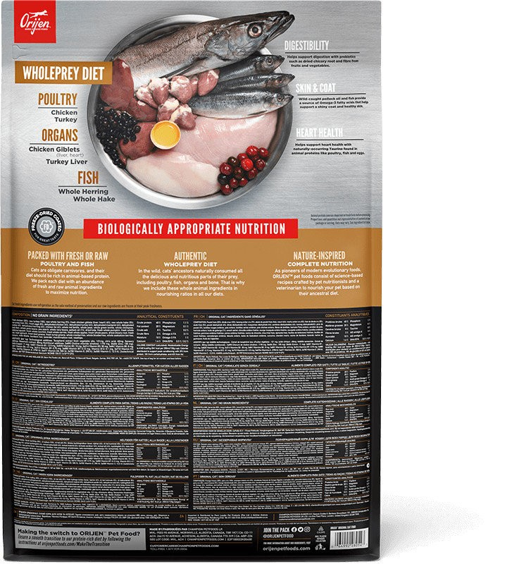 新鮮雞肉 (20%), 生鮮火雞肉 (10%), 生鮮完整鯡魚 (9%), 新鮮雞內臟 (肝, 心) (6%), 生鮮完整鱈魚 (5%), 生鮮火雞肝 (5%), 新鮮巢蛋 (5%), 脫水雞肉 (4%), 脫水火雞肉 (4%), 脫水鯖魚 (4%), 脫水沙丁魚 (4%), 脫水鯡魚 (4%), 雞脂肪 (4%), 完整紅扁豆, 完整豌豆, 完整綠扁豆, 完整鷹嘴豆, 扁豆纖維, 完整花豆, 豌豆澱粉, 完整白豆, 鱈魚油 (1%), 乾燥海帶, 新鮮完整南瓜, 新鮮完整冬南瓜, 新鮮完整櫛瓜, 新鮮完整胡蘿蔔, 新鮮完整蘋果, 新鮮完整梨子, 乾燥菊苣根, 新鮮甘藍, 新鮮菠菜, 新鮮甜菜葉, 新鮮蘿蔔葉, 完整蔓越莓, 完整藍莓, 完整薩斯卡通莓, 薑黃, 水飛薊, 牛蒡根, 薰衣草, 蜀葵根, 玫瑰果,