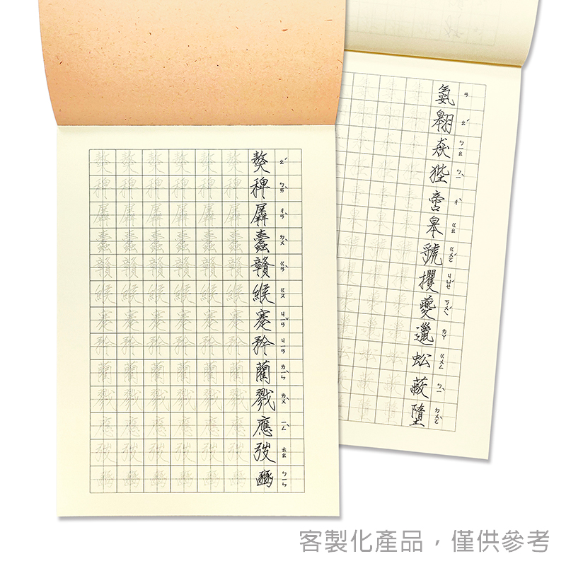 特色:此款客製化上翻膠裝硬筆習字本採用A4標準尺寸設計,結合功能性與學習導向。內頁選用80gsm米色道林紙,提供柔和護眼色調與穩定書寫手感,有效減少反光並提升長時間書寫舒適度。內含6張範例引導頁與34張習字格子頁,循序引導書寫練習節奏,提升學習效率。封面採220gsm棉絮紙單色印刷,呈現低調質感與自然紙張紋理,搭配上翻膠裝設計,使翻閱更順手耐用,兼具實用性與專業書寫體驗。提供客製化服務。