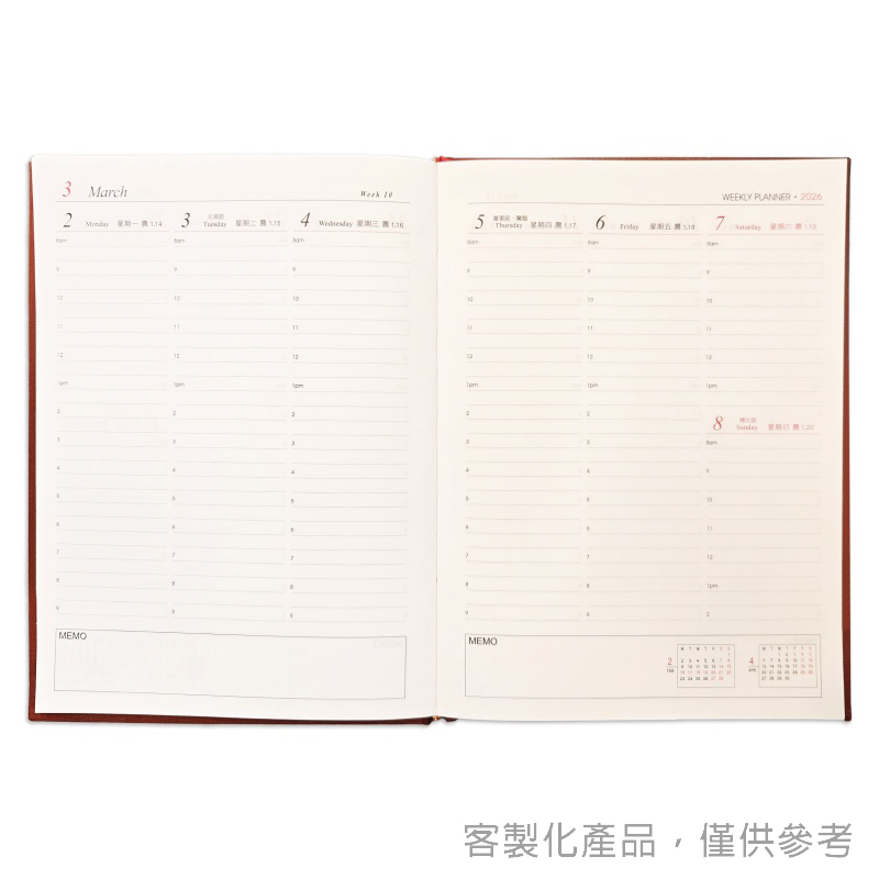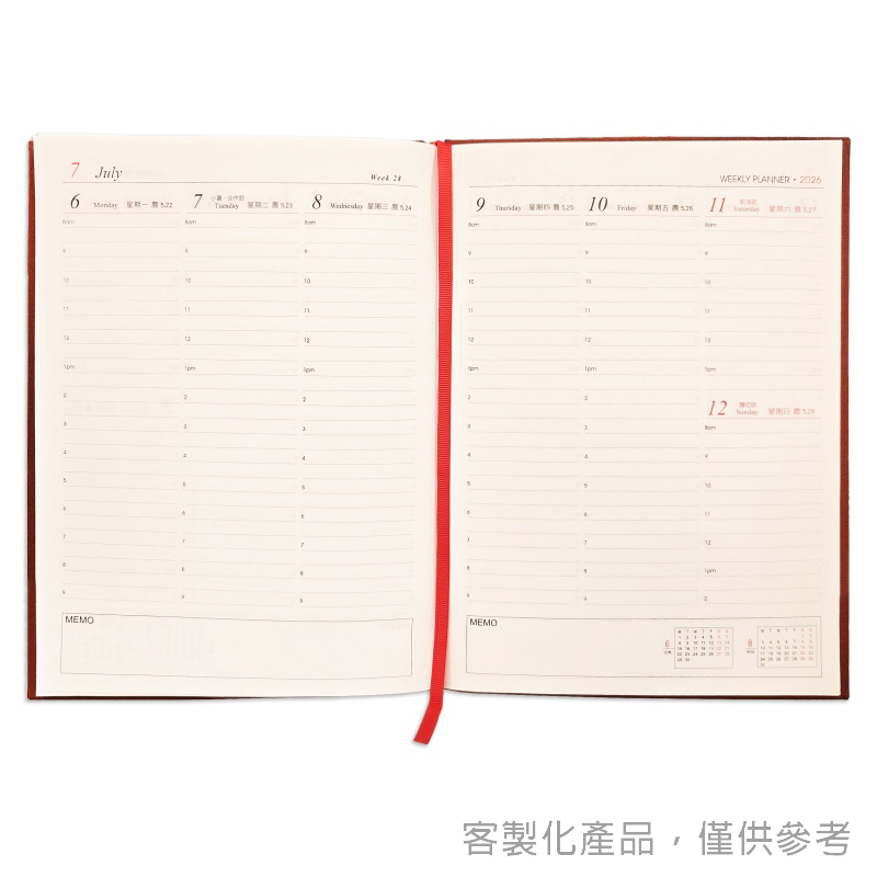 內頁:80gsm高質感米色道林、雙色印刷、公版內頁 – 直式左三右四週計劃