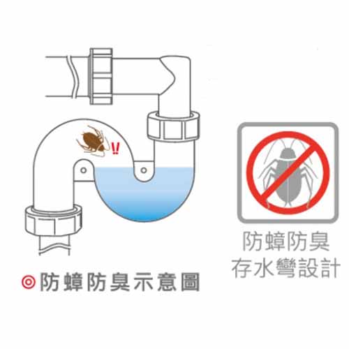 下方的S彎管設計,利用水將蟑螂及排水管臭味阻絕於外,達到防蟑防臭的效果。