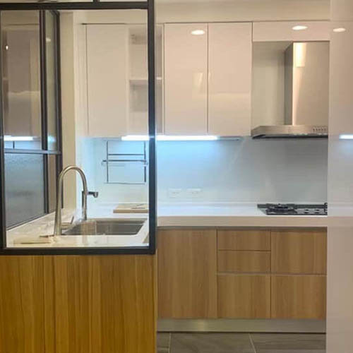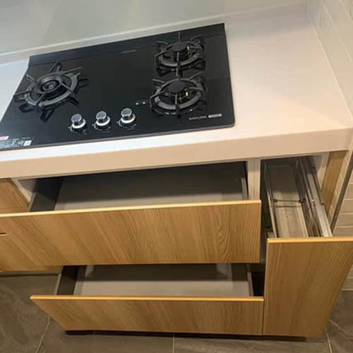 配件部分為了方便取用,設計調味側拉架、魔力抽組、轉角置物籃,使用上不僅有效運用空間且物品能隨手取得,而崁入式落地烘碗機將廚具整體美觀完美修飾,廚具機能完全到位。