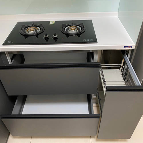 爐下抽頭式鋁抽、調味測拉架整齊收納碗盤及調味用品讓廚房空間不雜亂。