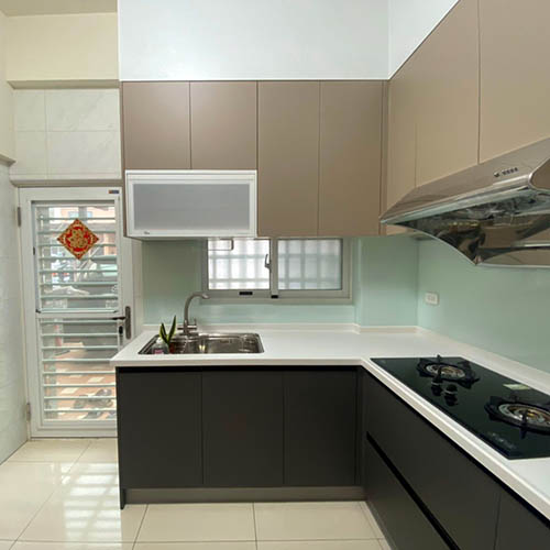 特意於上下廚櫃間貼強化玻璃避免油污噴濺方便廚房擦拭。