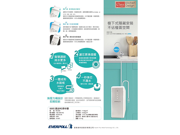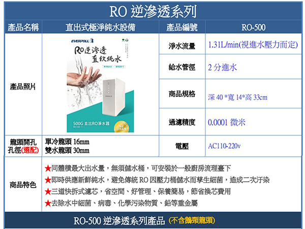EVERPOLL 500G 櫥下式直出RO逆滲透 無桶設計 體積輕巧RO-500(不含水龍頭,含基本安裝)