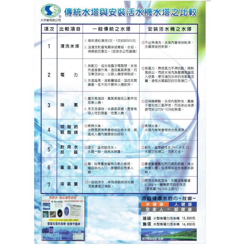 | 6 | 重金屬 | 鐵、鉛等重金屬無法氧化處理,隨自來水入口,身體吸收危害人體。 | 重金屬會氧化而沉澱到底層,減少危害人體;但須每年從水塔底部排掉。 |