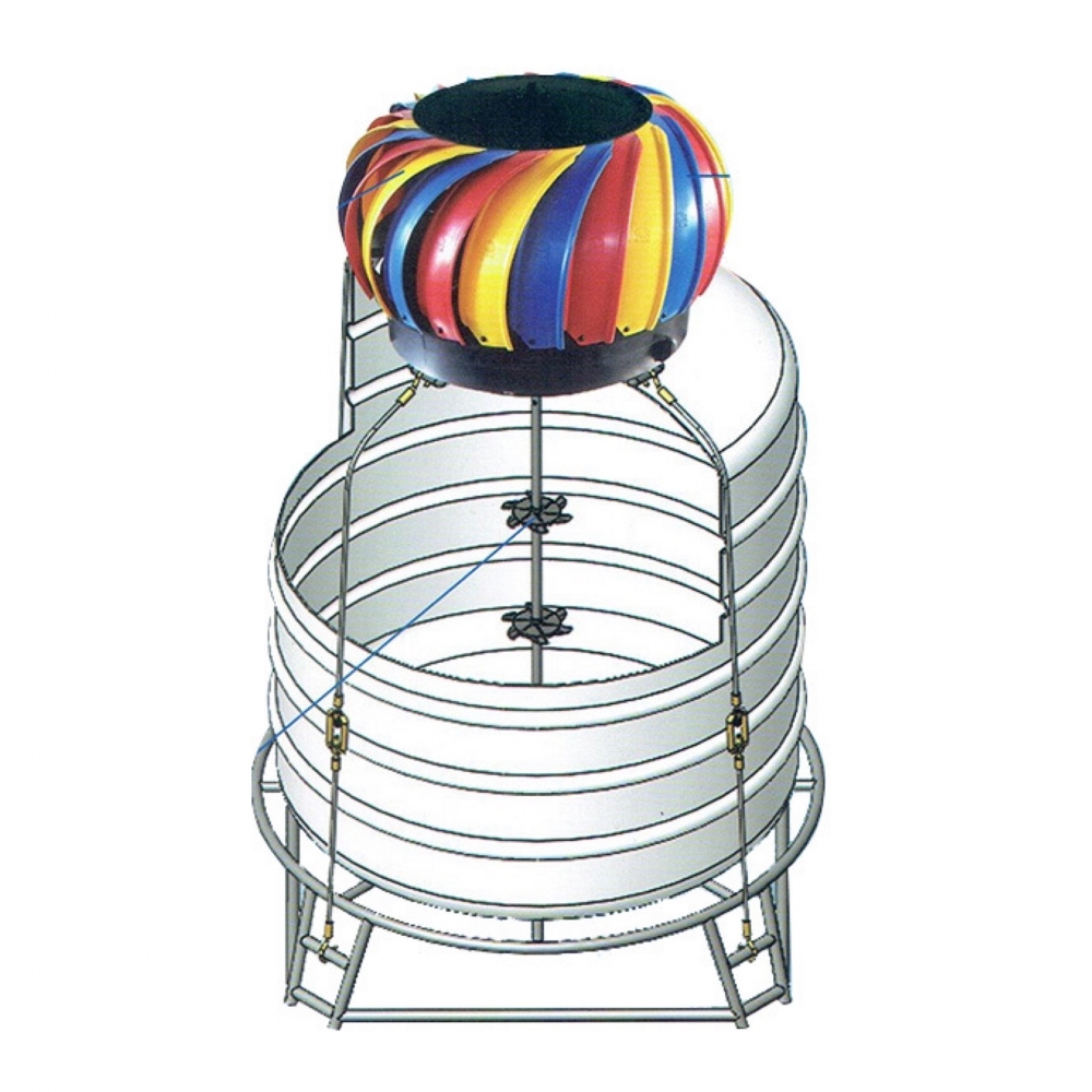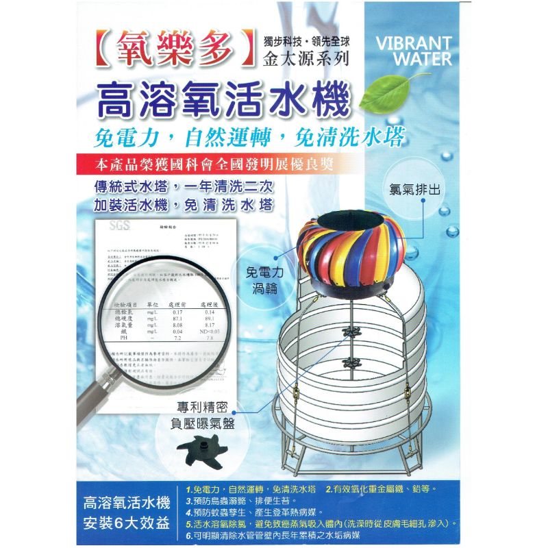 免電力,靠微風力不停吹動,將熱氣排出,同時水塔內負壓曝氣盤吸入空氣,更可增加水中的溶氧氣泡量,造成水質越加的甘甜順口。 |